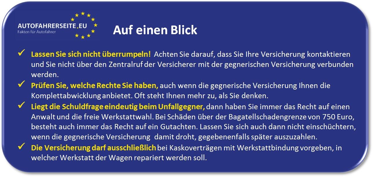 Was auf den ersten Blick nach tollem Service aussieht, kann für die Versicherten schnell große Nachteile mit sich bringen, denn durch die Versicherungen werden die Unfallschäden in sogenannte Partnerwerkstätten gesteuert. Diese folgen bei der Reparatur u.a. den von den Versicherungen festgelegten Vorgaben. Mit diesen verpflichten sie sich z.B., zu geringeren als normalerweise für die Instandsetzung üblichen Kosten, abzurechnen. Fest steht jedoch, dass im Haftpflichtschadenfall der Geschädigte immer das Recht hat, einen Anwalt mit der Vertretung seiner Interessen zu beauftragen und den Reparaturbetrieb frei zu wählen. Gleiches gilt für die Beauftragung eines Gutachtens durch einen unabhängigen Sachverständigen, wenn der Schaden eindeutig höher als 750 Euro ist.