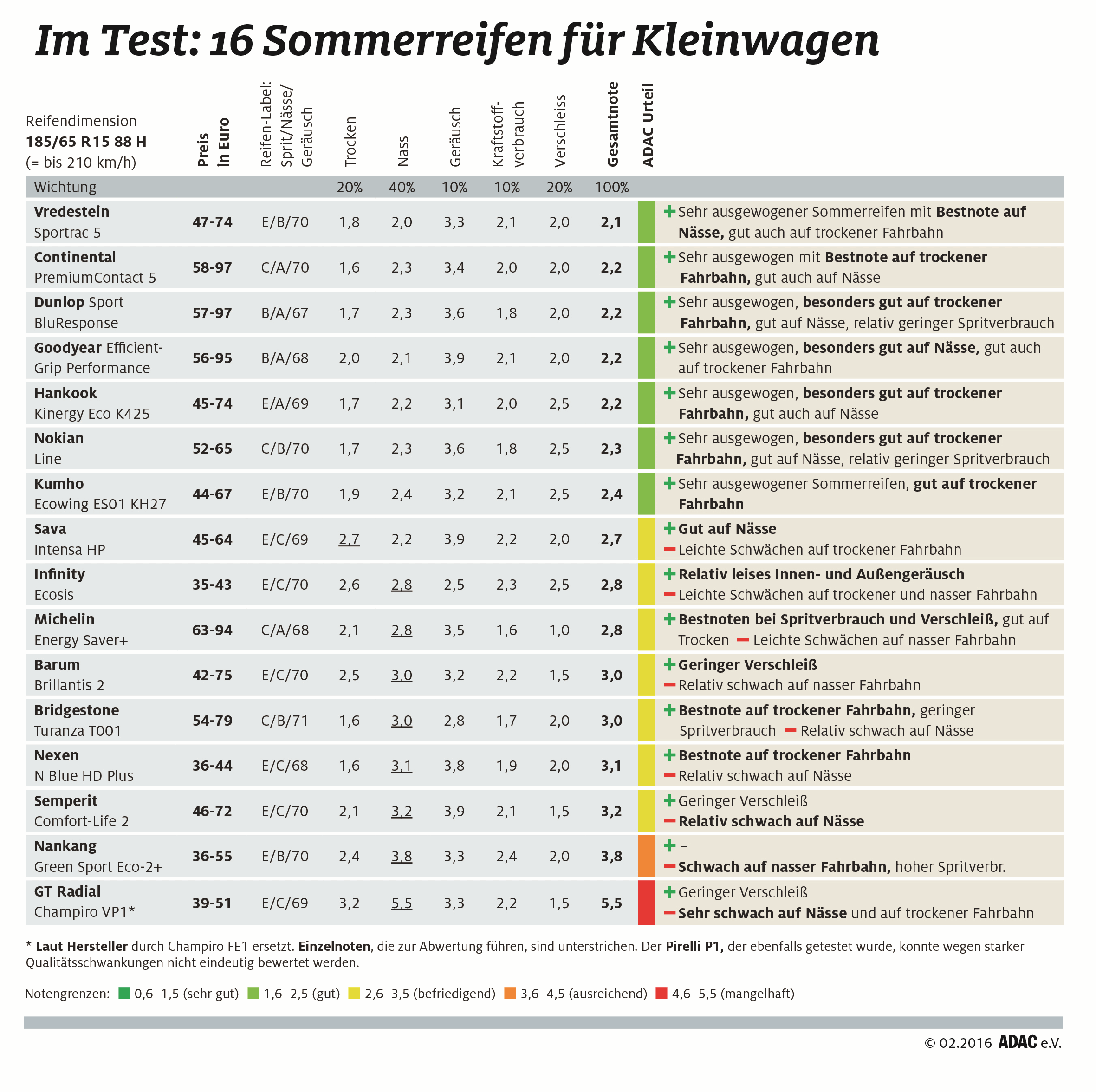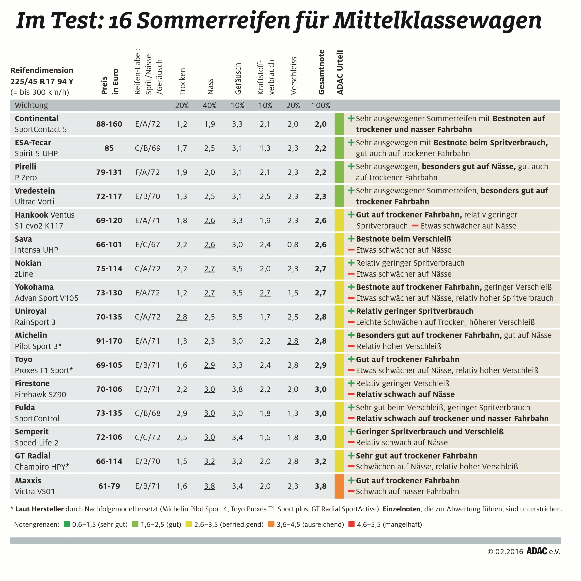 Gerade bei den mit „befriedigend“ beurteilten Reifen ist die schwächere Leistung auf nasser Fahrbahn der überwiegende Grund der Platzierung. Dabei befinden sich die Hersteller in einer Zwickmühle: Einerseits geht es darum, eine möglichst gute Performance zu bieten, andererseits ist aber auch eine gute Haftung auf nasser Fahrbahn ein Kriterium.